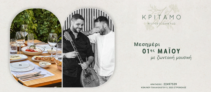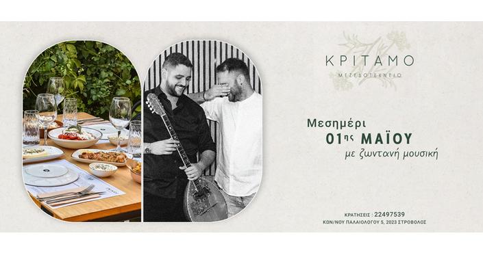Κυπριακή και ελληνική κουζίνα στην καλύτερη εκδοχή τους, με την δημιουργικότητα και τις πινελιές της νεαρής σεφ Αργυρώς Παπαδοπούλου και την 01 Μαΐου, σε μία έξοδο για όλη την παρέα ή την οικογένεια, στην ανοιξιάτικη και φιλόξενη ατμόσφαιρα του Κρίταμο Μεζεδοχνείου.