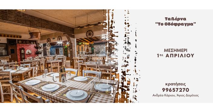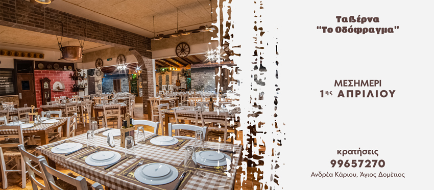 Μεστή Κυπριακή Κουζίνα που ξεχειλίζει παράδοση, εγκάρδια φιλοξενία με χαμόγελα και ζεστασιά, και το Μεσημέρι της 1ης Απριλίου, τόσο στον εσωτερικό όσο και τον ζεστό εξωτερικό στεγασμένο χώρο της ταβέρνας Το Οδόφραγμα!