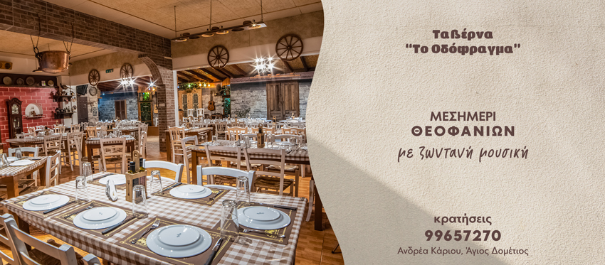 Μεστή Κυπριακή Κουζίνα που ξεχειλίζει παράδοση, εγκάρδια φιλοξενία με χαμόγελα και ζεστασιά, και το Μεσημέρι των Θεοφανίων, τόσο στον εσωτερικό όσο και τον ζεστό εξωτερικό στεγασμένο χώρο της ταβέρνας Το Οδόφραγμα!