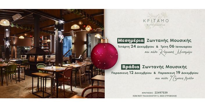 Ένας από τους δημοφιλέστερους προορισμούς για Κυπριακή και Ελληνική κουζίνα στην Λευκωσία, το Μεζεδοτεχνείο Κρίταμο, ανακοίνωσε το Χριστουγεννιάτικο Εορταστικό Πρόγραμμά του, που πέραν των καλοφτιαγμένων γεύσεων που επιμελείται η νεαρή ταλαντούχα σεφ Αργυρώ Παπαδοπούλου και της εγκάρδιας ζωηρής φιλοξενίας της ομάδας της, το εστιατόριο ντύνει μουσικά αρκετά από τα Μεσημέρια και τα βράδια του Δεκεμβρίου και Ιανουαρίου.