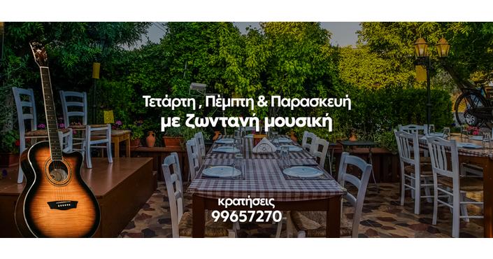 Οι παραδοσιακοί μεζέδες και το οφτό κλέφτικο έχουν την τιμητική τους, σε μια δροσερή και φιλόξενη ατμόσφαιρα με εγκάρδια εξυπηρέτηση, που πλαισιώνουν κάθε βράδυ Πέμπτης, Παρασκευής και Σαββάτου, ταλαντούχοι μουσικοί με τις υπέροχες φωνές και τα τραγούδια τους.